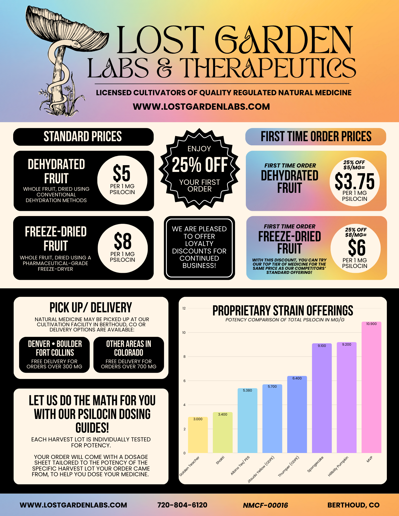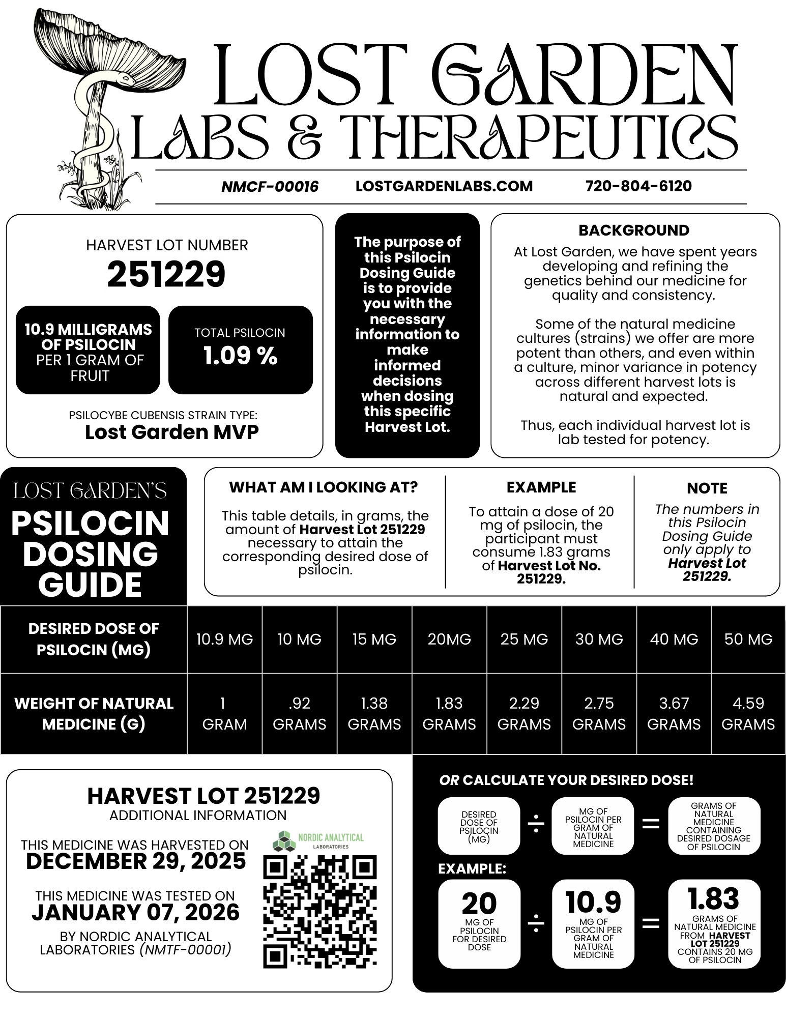 To assist you, each Lost Garden natural medicine order comes accompanied by a Psilocin Dosing Guide. Each dosing guide is individually tailored to accurately reflect the potency of the specific harvest lot that the medicine came from. This guide exists for your reference and convenience when dosing our medicine.