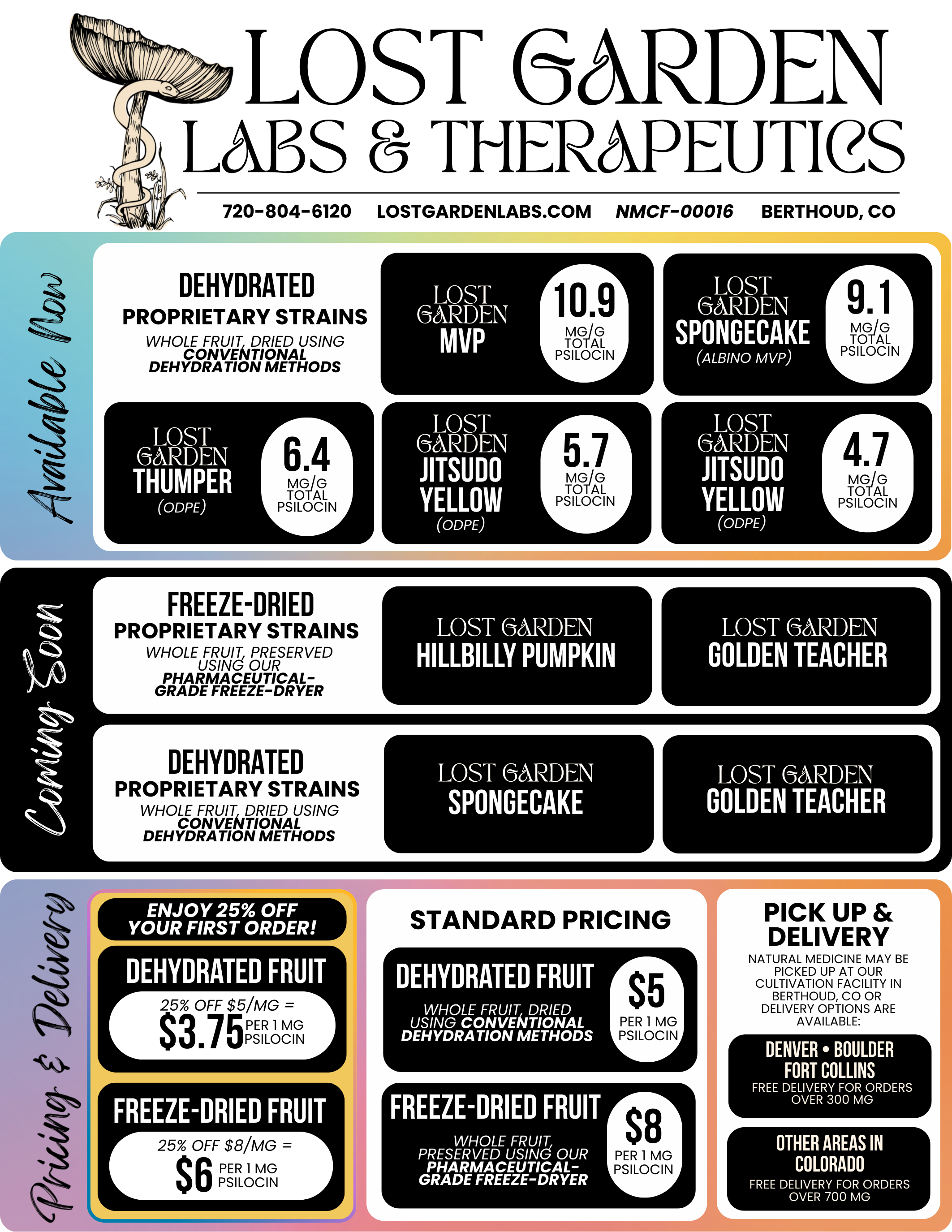 On November 24, 2025, Lost Garden Labs was officially licensed by the State of Colorado to produce natural medicine! This license marks the culmination of an intense period of preparation, dedication, research, and hard work. Throughout all of that time, we eagerly awaited the moment our medicine could be used by licensed facilitators across the state to aid in their important work in the healing space. Now, that moment is finally here!