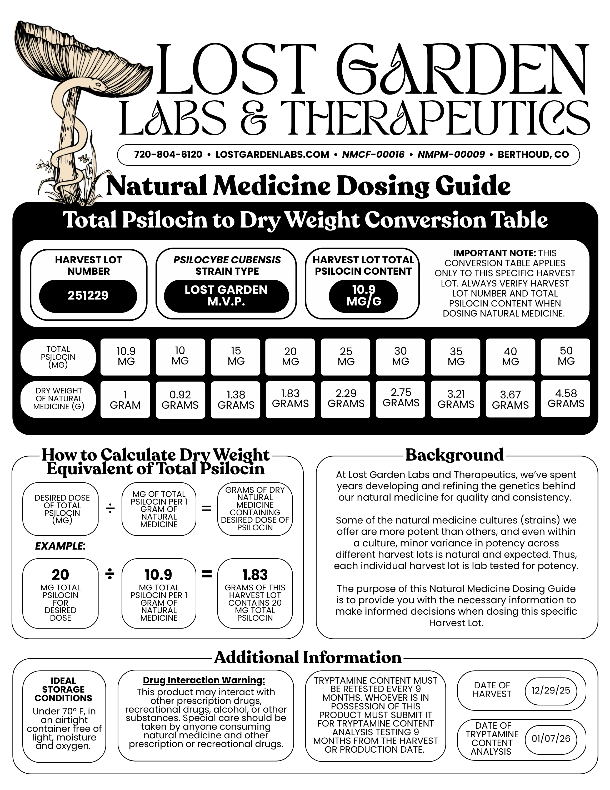 To further assist you, each Lost Garden natural medicine order comes accompanied by a Natural Medicine Dosing Guide. Each dosing guide is individually tailored to accurately reflect the potency of the specific harvest lot that the medicine in your order came from. This guide exists for your reference and convenience when dosing our medicine.
